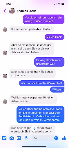 At first, Laska complimented her writing. But as they talked, Mary Claire could tell, “he liked putting me down and correcting my German, even though I said I only knew a little German.” Laska messaged her, “at rapid-fire - he was incessant.” She could barely keep up using Google Translate. While they talked, Mary Claire asked her cousin, a translator in Vienna, to provide a translated quote. When Mary Claire sent it to Laska, he said, “Thanks anyways.” She followed up to see if Laska needed anything else, “All good?” He responded, “why do you ask?” For Mary Claire, “his lack of professionalism and lack of clear intentions” infuriated her.