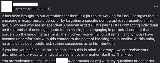 “It has been brought to our attention that there is a journalist working for Das Opernglas that is engaging in inappropriate behavior by targeting a specific demographic represented in this group (women who are independent American artists). This journalist is contacting individuals on the premise of needing a quote for an article, then engaging in perpetual contact that borders on the line of harassment. The involved women (who will remain anonymous) have become uncomfortable with this contact to the point of blocking the journalist. At this point, no article has been published, raising suspicions as to his intentions.”