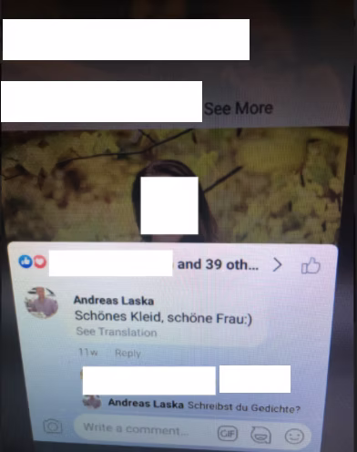 Some women gave clear signals they did not want further contact, but Laska pursued them over weeks and months in voice and text messages: “It makes me somehow sad we don’t talk anymore. I liked our conversations.” In some cases, Andreas Laska stopped contacting the women; in others, the contact increased so frequently the women blocked him on all social media.